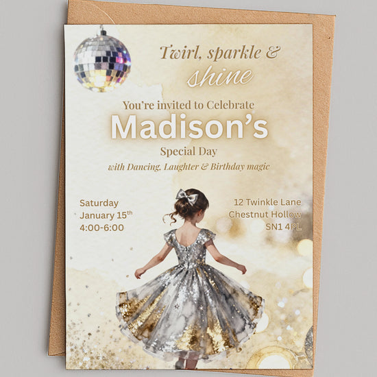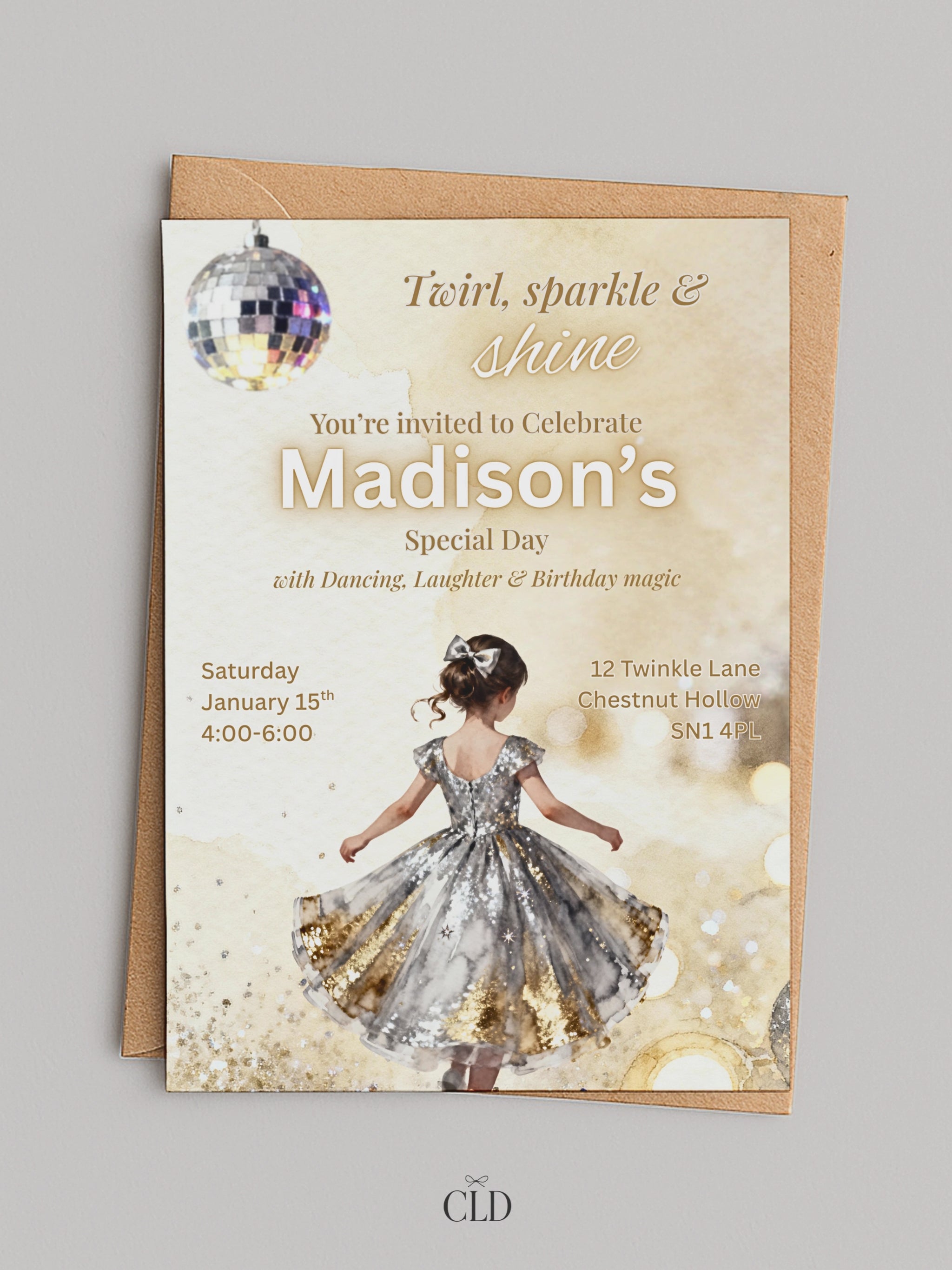 Celebrate your little one’s special day with this elegant dance birthday invitation, featuring a shimmering disco ball, twinkling gold details, and a watercolor girl in a sparkling dress. Perfect for dance parties, ballerina birthdays, or any event that calls for a touch of glamour.